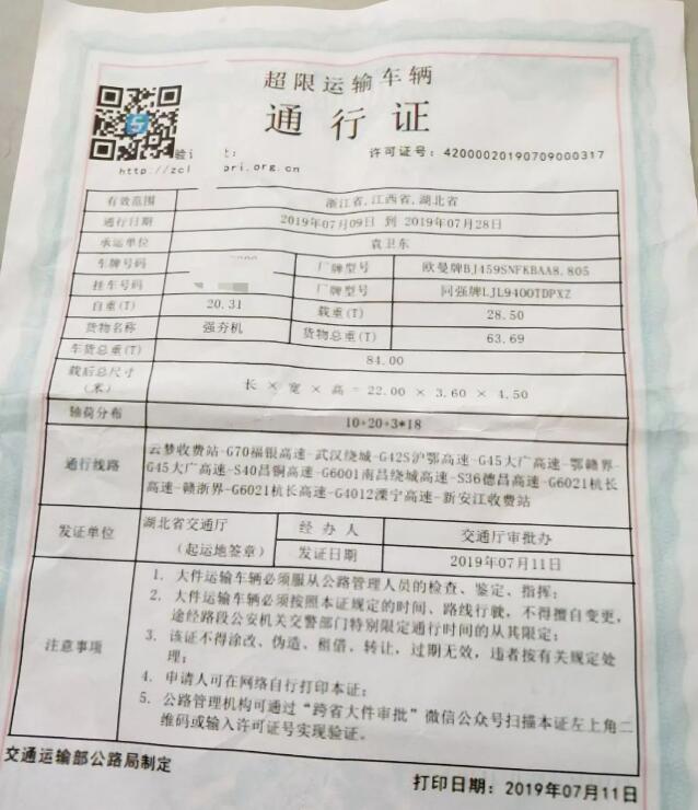 可通過(guò)《超限運(yùn)輸車輛通行證》左上角提供的查驗(yàn)網(wǎng)址(二維碼)進(jìn)行驗(yàn)證。