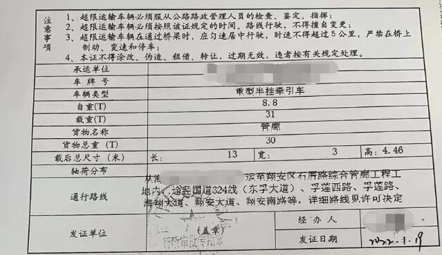 4月7日下午16時(shí),一部運(yùn)載水泥管的運(yùn)輸車輛途徑東孚超限運(yùn)輸檢測(cè)站,過磅顯示車貨總重53.65噸,同時(shí)該車還存在超高超寬的幾何超限行為。駕駛員拿出一張《福建省超限運(yùn)輸車輛通行證》,向執(zhí)法人員表示該車已辦理超限運(yùn)輸許可手續(xù)。