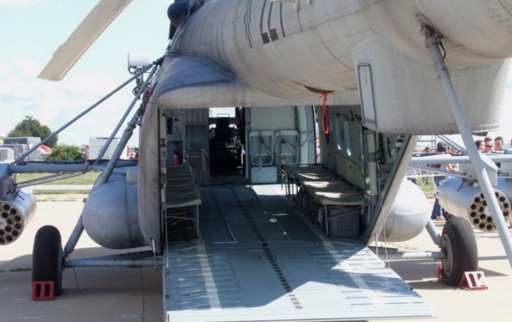 貨艙前后艙門采用液壓裝置開閉,分別可在7分鐘和3分鐘內(nèi)打開。貨艙頂部裝有2個起重能力為10噸的吊車,地板上還另外有2部牽引力為3噸的絞盤車。由于貨艙空間很大,安-124能夠運載普通飛機(jī)機(jī)身、化工廠塔件等大型貨物。